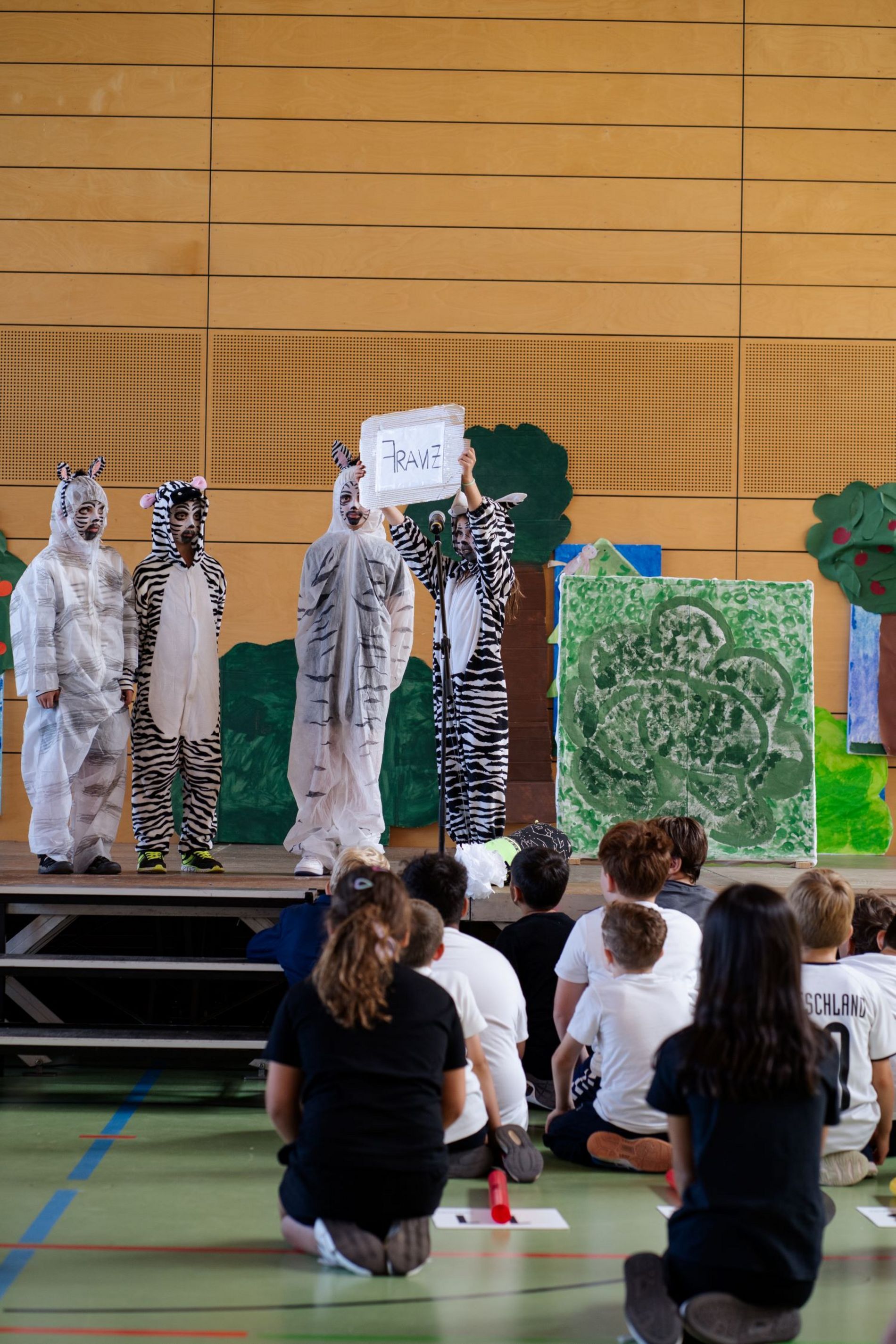 Es dauerte nicht lange und die Erstklässler waren in den Bann eines Theaterstückes gefesselt. Sehr überzeugend und mit viel Eifer führten die Viertklässlerinnen und Viertklässler das Theaterstück „Die Geschichte vom Löwen, der nicht schreiben konnte“ auf. Auf der Bühne konnte man Kinder in tollen Wildtier-Kostümen, ein trompetenspielendes Zebra sowie singende, tanzende und boomwhackerspielende Kinder vor der Bühne bewundern.